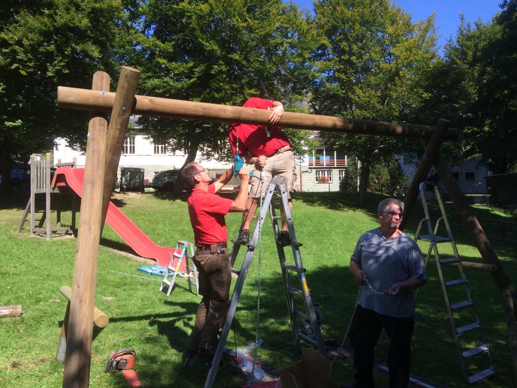 Mit tatkräftiger Unterstützung von Jochen und Sebastian Bolte, von der gleichnamigen Tischler- und Bauschreinerei  Tischlerei Bolte OHG in Ahlen, haben Mitglieder des Trägervereins das neue Schaukelgerüst aufgestellt. Jetzt steht den Schaukelspaß nichts mehr im Wege.