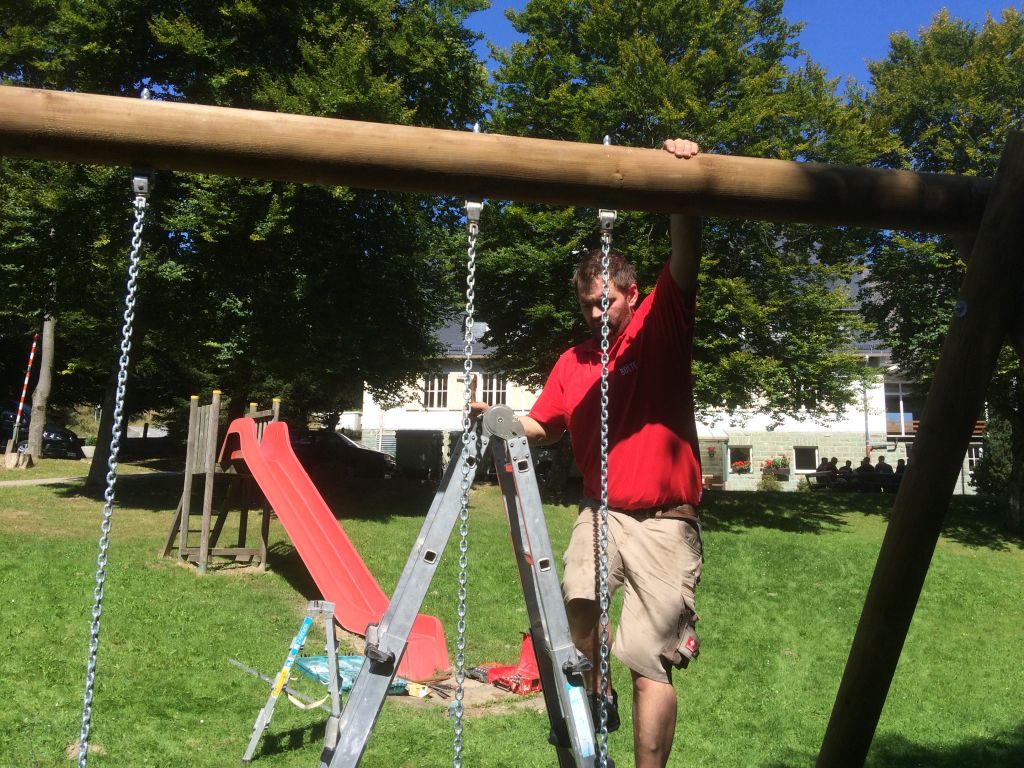 Mit tatkräftiger Unterstützung von Jochen und Sebastian Bolte, von der gleichnamigen Tischler- und Bauschreinerei  Tischlerei Bolte OHG in Ahlen, haben Mitglieder des Trägervereins das neue Schaukelgerüst aufgestellt. Jetzt steht den Schaukelspaß nichts mehr im Wege.