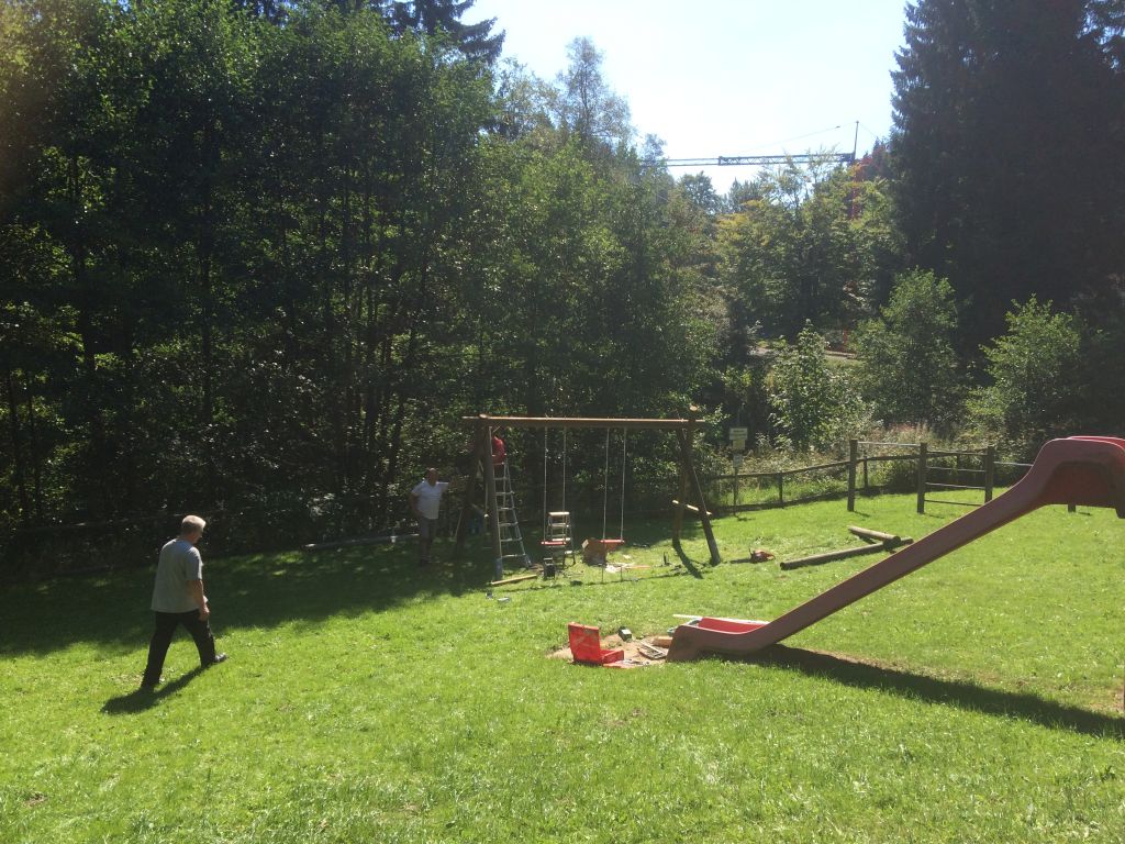 Mit tatkräftiger Unterstützung von Jochen und Sebastian Bolte, von der gleichnamigen Tischler- und Bauschreinerei  Tischlerei Bolte OHG in Ahlen, haben Mitglieder des Trägervereins das neue Schaukelgerüst aufgestellt. Jetzt steht den Schaukelspaß nichts mehr im Wege.